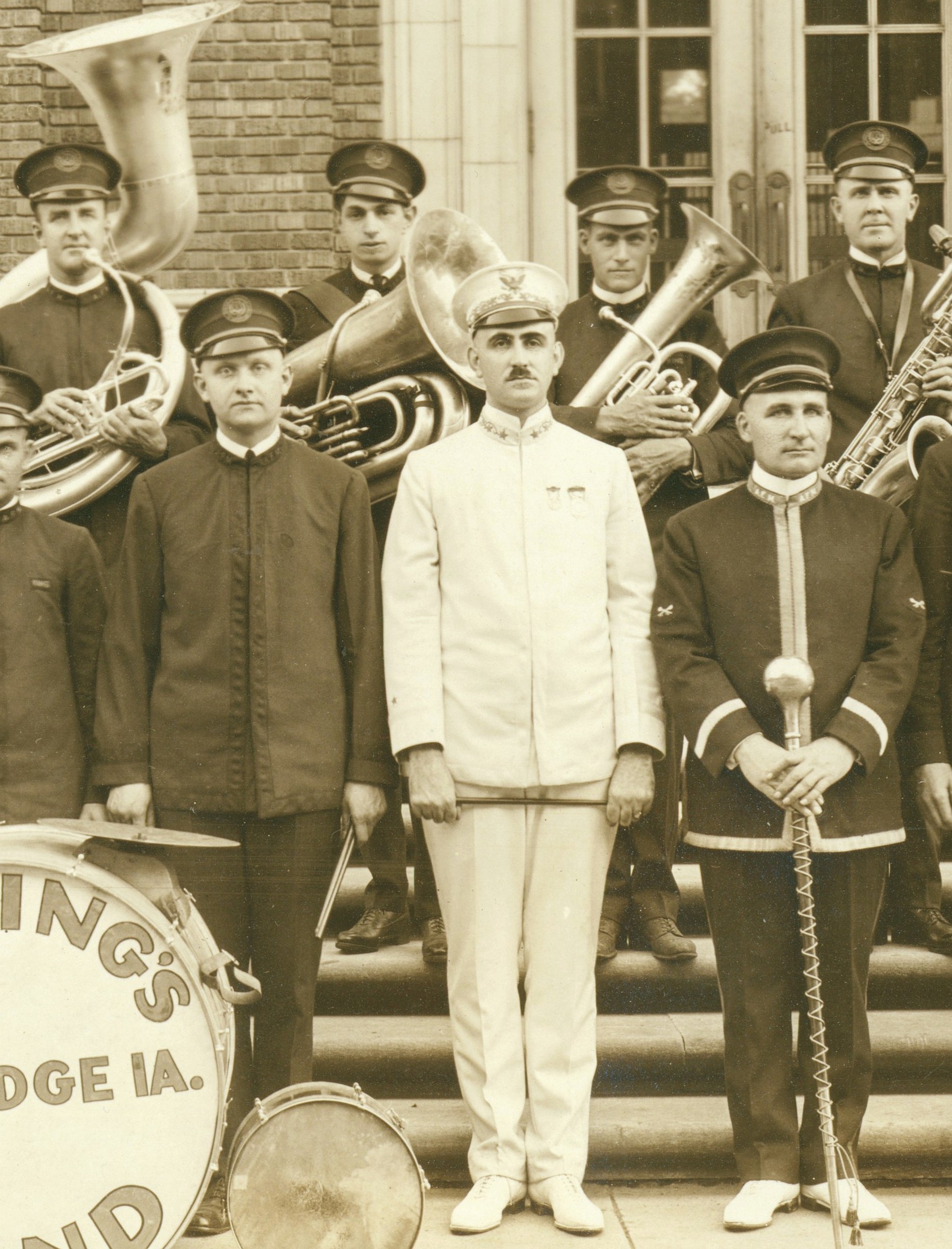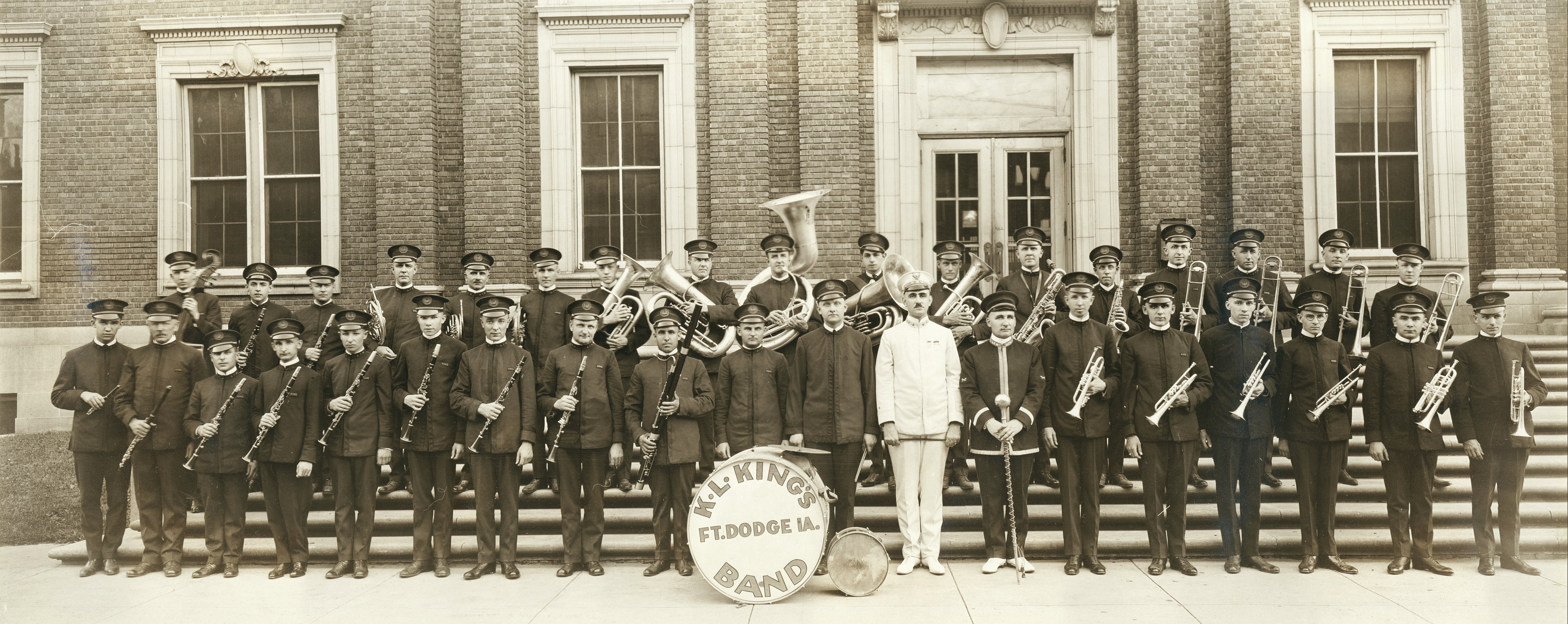 Flautist Joe Kautzky stands second from left in the front row; trumpet player Walt Engelbart is third player to the right of Karl King, who is wearing the white uniform. Carl Pray is the baritone sax player in the back row in front of the City Hall doors. The Online Photo Archive contains more information about these men and the history of the early bands of Fort Dodge.