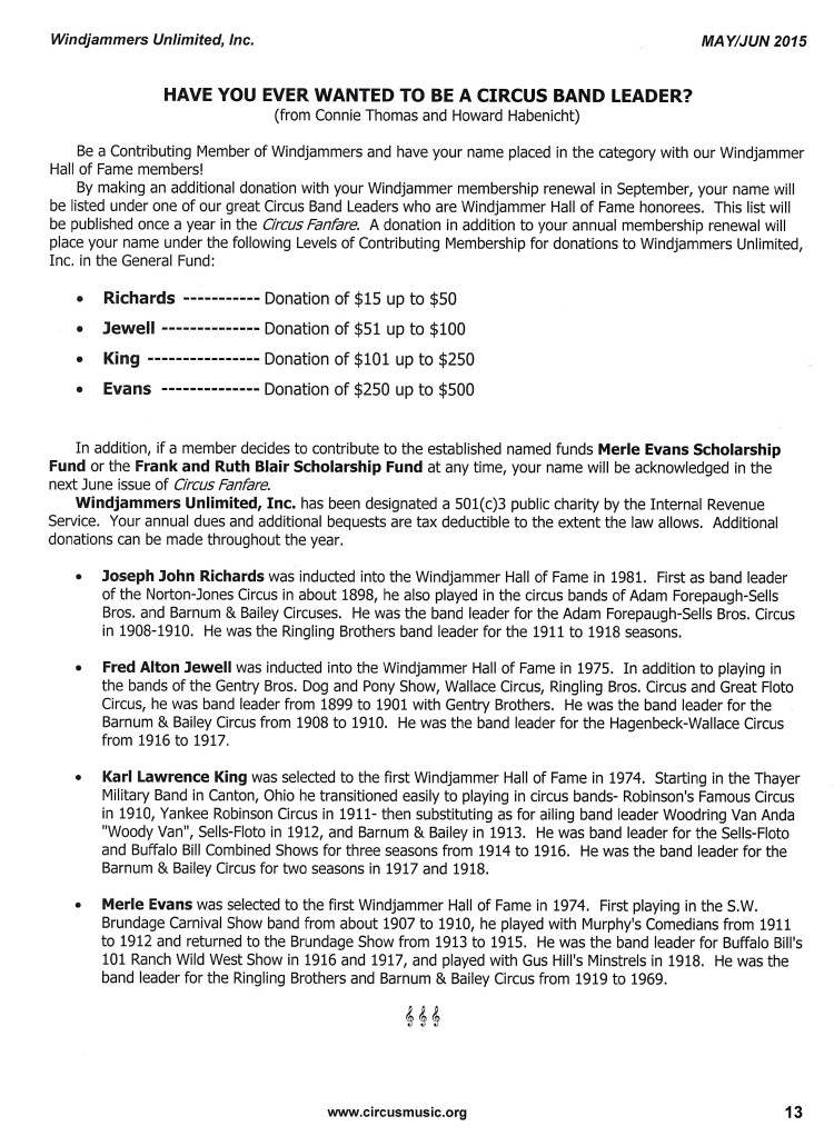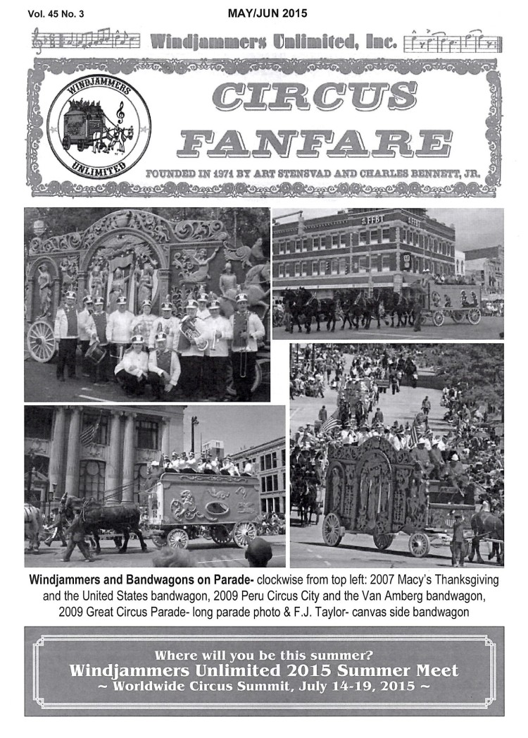 The official publication of the society is “Circus Fanfare”. This newsletter is produced bi-monthly, and distributed to society members. It features interesting pictures and stories of circus bands and their musicians, stories of mud shows, traveling circuses, Shrine circuses, repertories of circus band advertisements, and general society news.