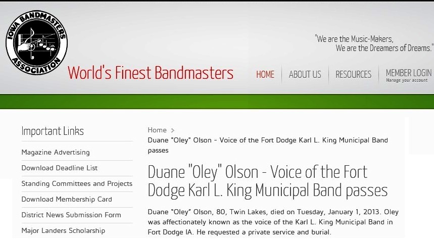 Duane "Oley" Olson - Voice of the Fort Dodge Karl L. King Municipal Band passes Duane “Oley” Olson, 80, Twin Lakes,