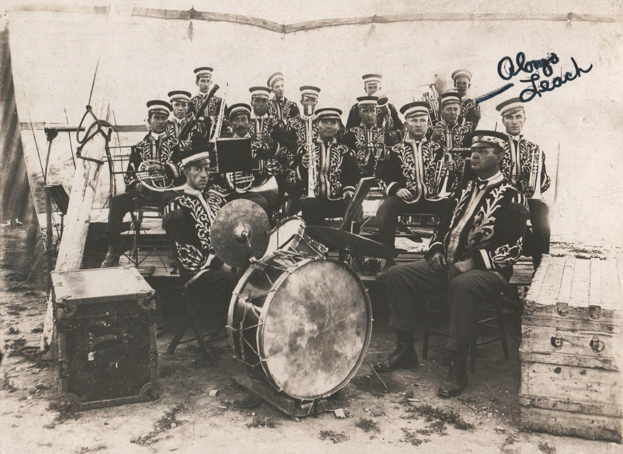 During the 1913 season, Alonzo Leach performed with the Gentry Brothers Dog and Pony Show. The next year he was invited by Karl King to join the Sells-Floto and Buffalo Bill Wild West Combined Shows Band. Alonzo later taught flute lessons and was director of Drake Bands for ten years. He directed the Shrine Band 13 years, was one of the founders of Iowa Bandmasters Association, secretary for that organization for 40 years, and directed massed bands at Riverview Park for many years.