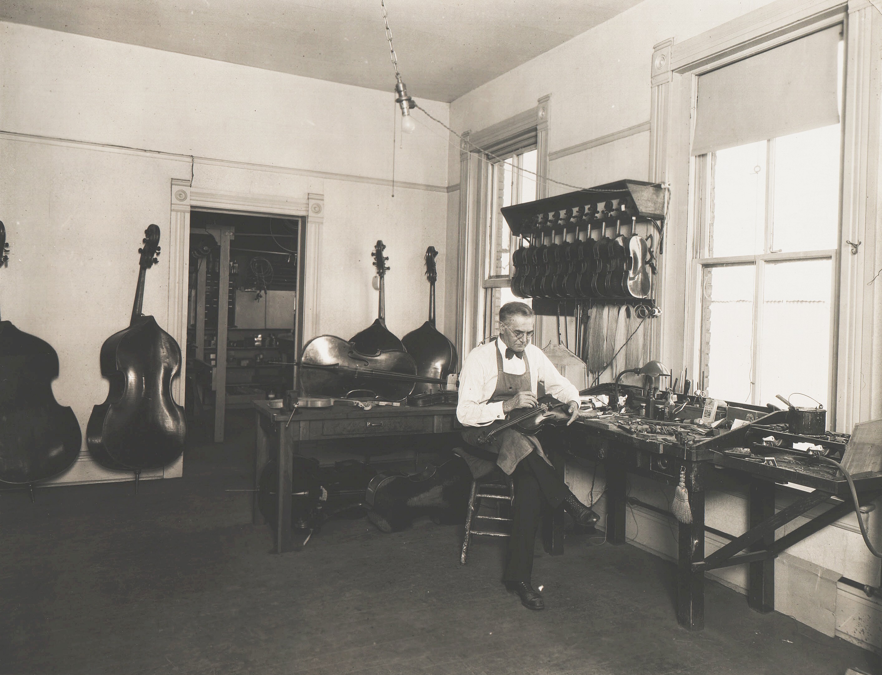 Interior of the repair room of the Alonzo Leach Music Store, 805½ Locust Street in Des Moines