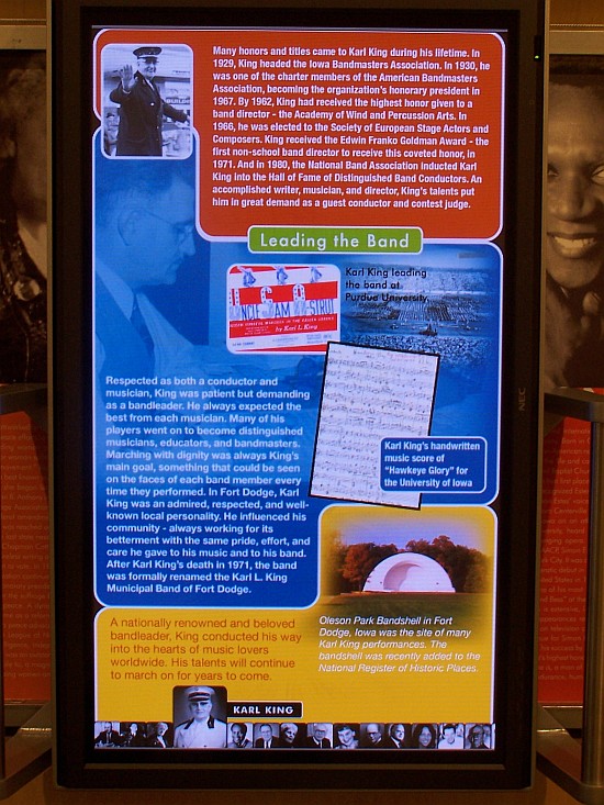 Choose from 39 touch screens and 28 monitors to hear 107 interviews and play games designed to teach. At the end of the trek through the displays, enter the Hall of Heroes, which has tributes to 30 notable Iowans, including one of composer Karl King of Fort Dodge. The static exhibits are then activated by dragging an electronic magnifying glass of sorts over the wall displays to activate the mobile displays.