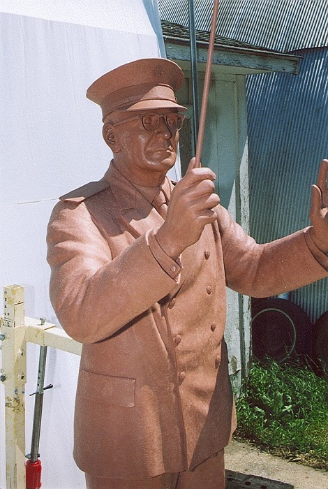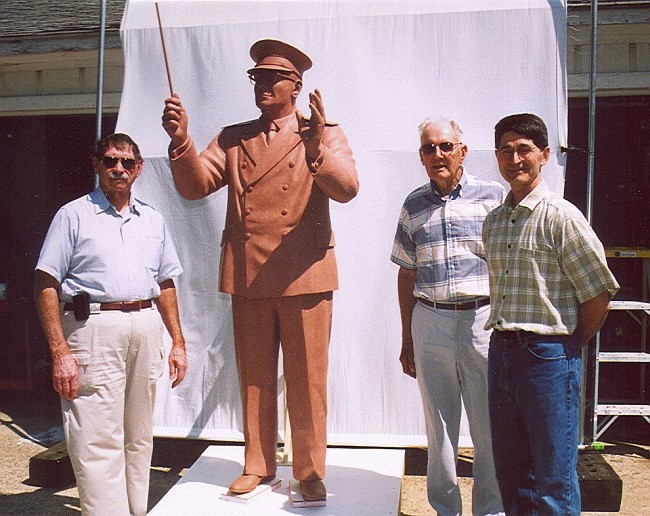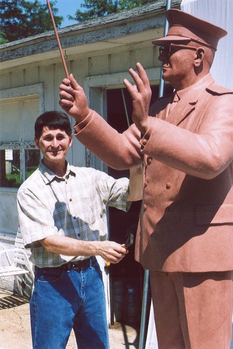 Oley and Nancy Olson, along with chief fundraiser Harlan Pfaff, recently traveled to Minnesota to see first hand the progress being made on the larger-than-life sculpture of Karl King. The figure is now entirely blocked out in clay, with the clay detailing coming along well. Following the detailing process, the clay mold will be coated with a rubber compound to make a mold of the sculpture. With that rubber mold the statue will be reproduced in wax. The wax reproduction will then be used in sections to make the bronze castings which will form the final sturdy statue.