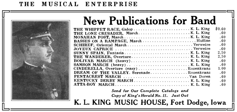 Karl King's gift for composing was apparent at an early age, and he had several compositions published while still in his teens. In all, King published over 200 marches. In addition to this impressive feat, which earned him the title America's March King, he also composed waltzes, overtures, intermezzos, serenades, dirges, rags, and galops, totaling almost another 100 selections.