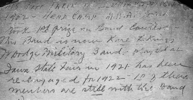 Carl Quist was appointed Chief Musician of the Fort Dodge Regimental Band yearly through 1909. Also, in 1903, the band won national attention by becoming the Grand Champion Band at the Modern Woodmen of America National Encampment held in Indianapolis. In 1904 the band was the winner again when the encampment was held in conjunction with the St. Louis World's Fair.