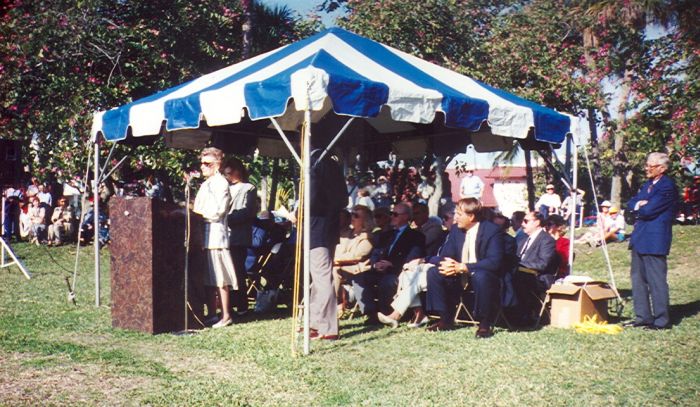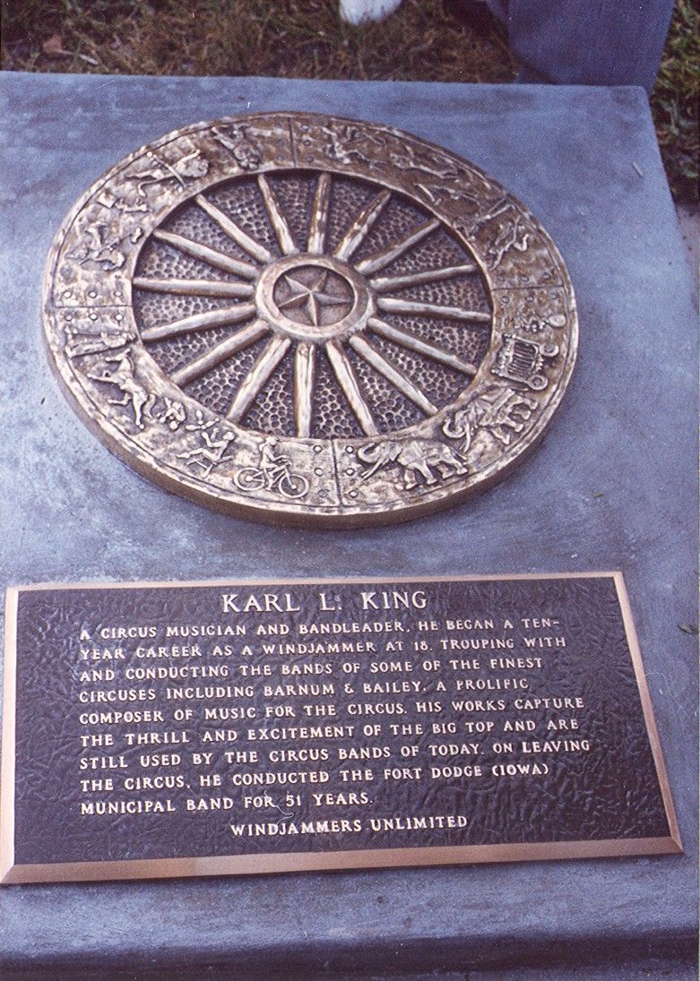 In a ceremony held at St. Armands Circle in Sarasota, Florida in 1995, Karl L. King was posthumously inducted into the Circus Ring of Fame. That Ring of Fame is a walkway of plaques set in concrete memorials in the shade of Circle Park's palm trees, paying homage to more than 70 artists and entrepreneurs who represent the finest talent of the circus world. The photo above shows King's daughter-in-law, Lois King of San Antonio, speaking at the ceremony which was held in conjunction with the winter convention of Windjammers Unlimited. Before the ceremony, a 50 piece band of Windjammers, a national organization dedicated to the preservation of circus music, performed a concert of Karl King circus music.