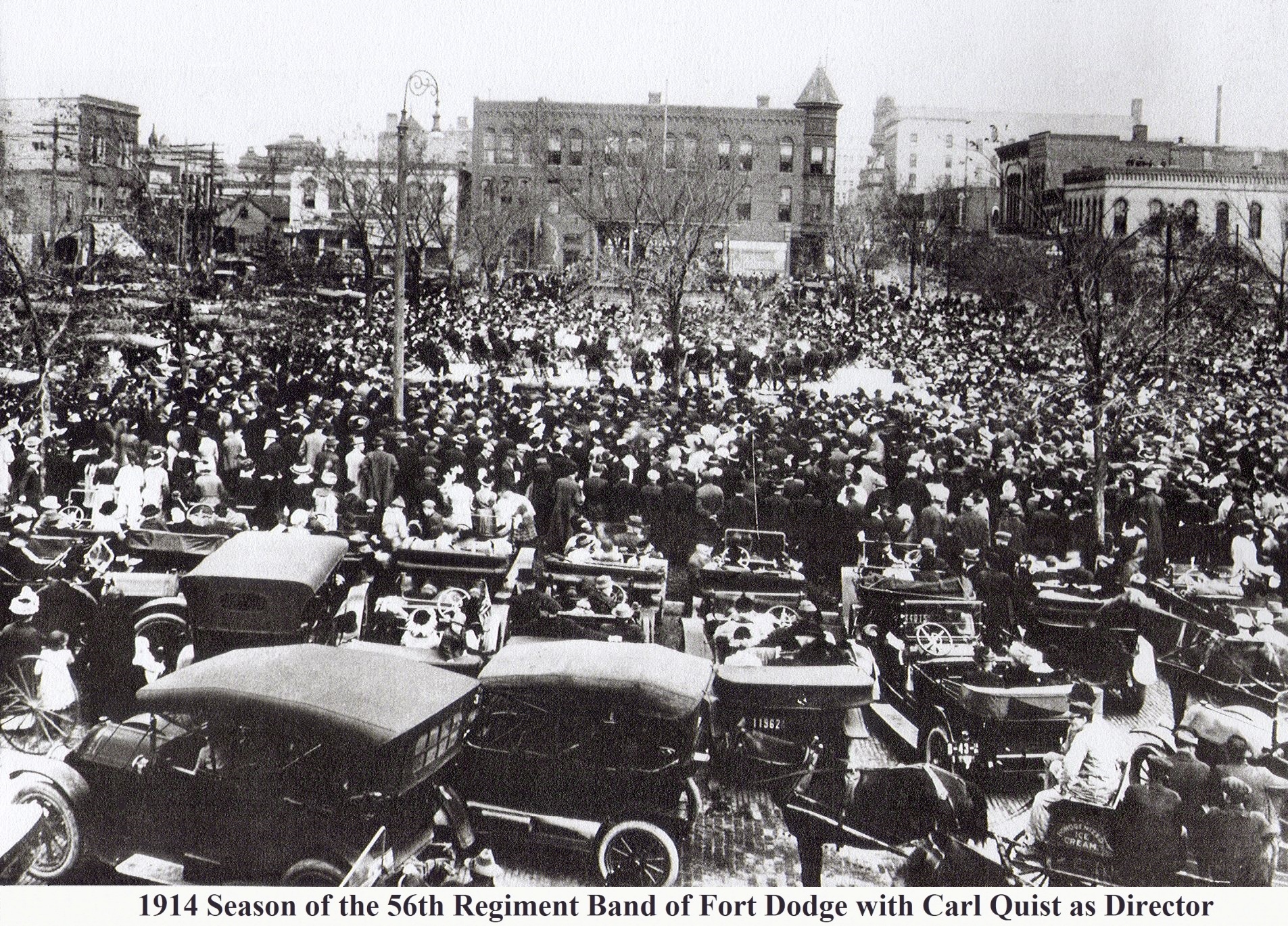 Thousands jammed the City Square in Fort Dodge for this 1914 concert presented by the 56th Iowa Regimental Band of Fort Dodge directed by Carl Quist. A special platform was erected at the square to accommodate the band. The crowd ringed the bandstand and stood during the entire concert except for those fortunate enough to have automobiles at that time. The early models of autos are visible in the foreground, some with tops put up and others with tops down. Note that in this time before standardization, a number of right hand drive cars are seen. Horse drawn vehicles were still used in the era as shown in the lower right hand corner. One horse is hitched to an ice cream company delivery wagon and another is harnessed to a buggy.