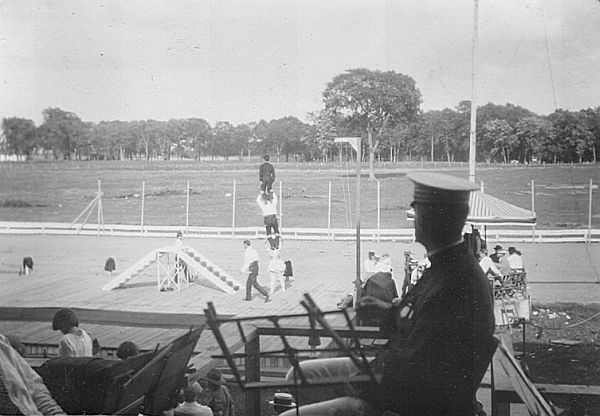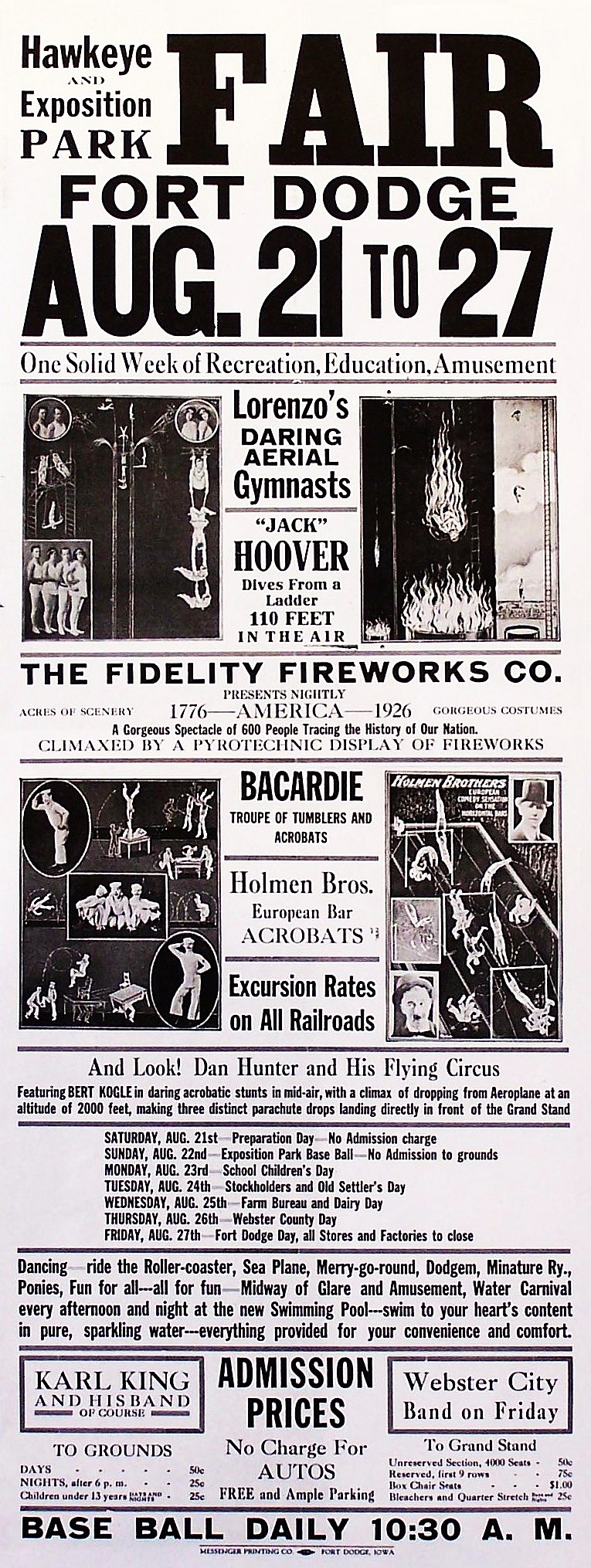 Karl King is shown in these photos from the 1924 Hawkeye Fair in Fort Dodge watching the show while conducting, so that he may coordinate the music with the act. The trumpet player is John Magennis, who twice had served as temporary bandmaster of Fort Dodge's Iowa Military Band (for the 1917 and 1918 seasons until Carl Quist returned from his duties with the Eagle Grove Municipal Band, and again while the community searched for a new director after Carl Quist left the Fort Dodge area in 1920).