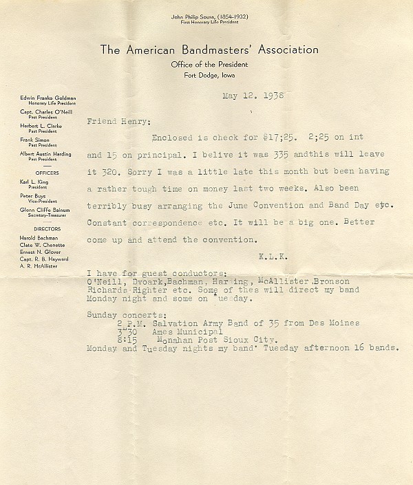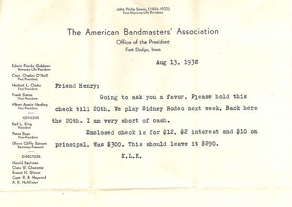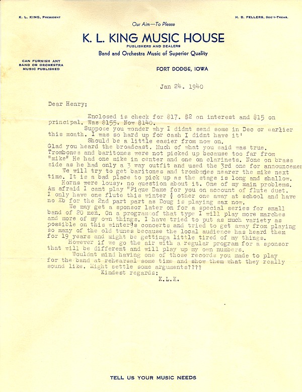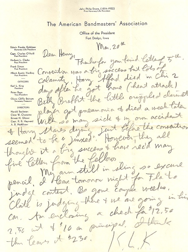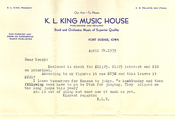 Although Karl King usually typed his correspondence, this letter to his good friend Henry Killinger was hand written because Karl's arm was in a sling following a musical accident at a rehearsal. Karl would always indicate or give the accents to his bass drummer and cymbal player. One day this procedure, accompanied by a foot stomp, resulted in his falling off the podium and breaking his wrist. He went to the hospital and returned to the rehearsal with his arm in a sling. He jokingly admonished his cymbal player for missing the beat and causing the accident.