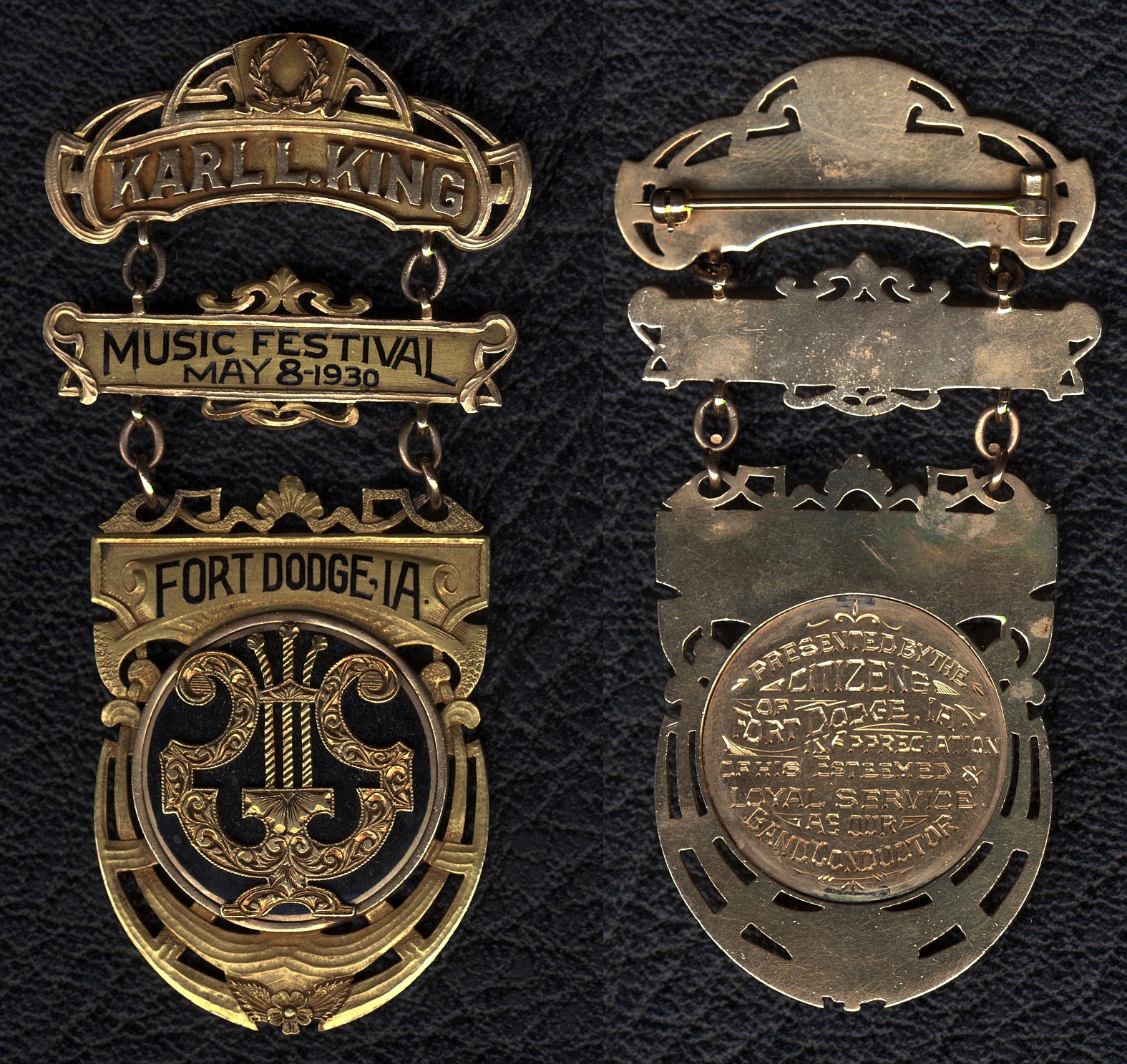 Karl King is pictured receiving the medal from C. V. Findlay, the Mayor of Fort Dodge.