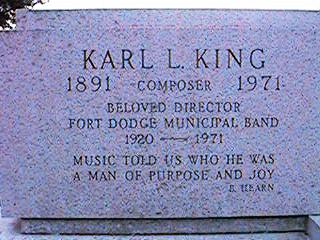 The Karl King monument is located just inside the South entrance to North Lawn Cemetery on the north end of 15th Avenue in Fort Dodge.