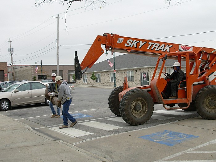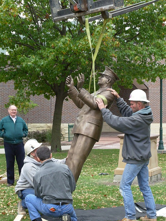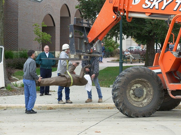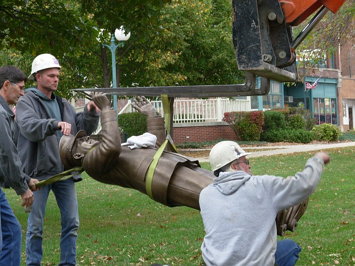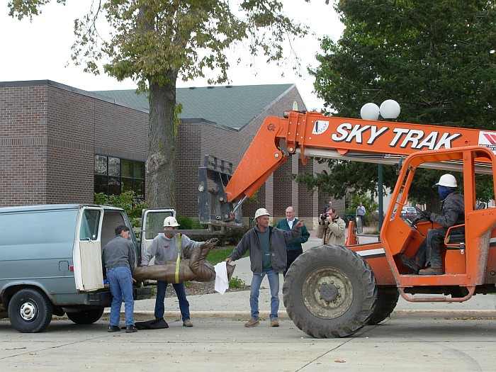 Paul Rieffer (holding statue feet) and the construction crew are shown delivering the bronze statue.