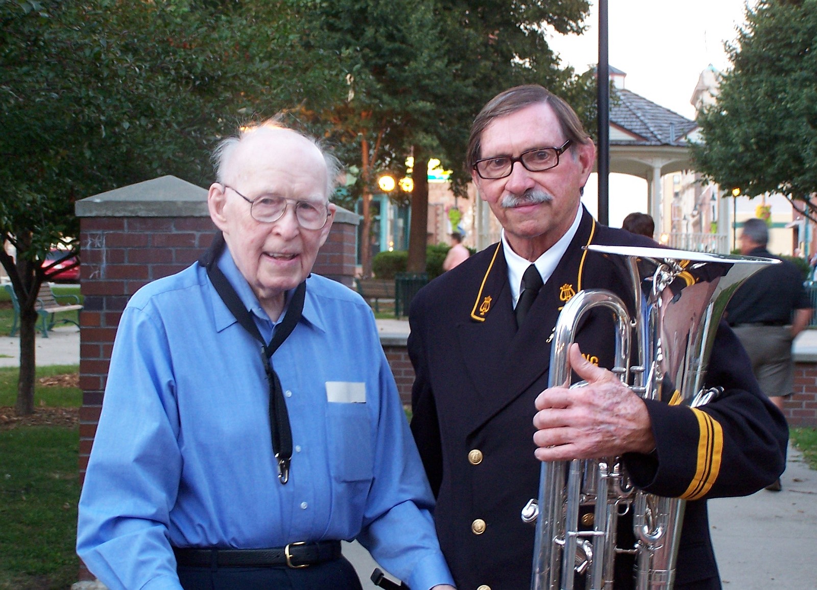 101-year-old performer Paul Olson is seen here with Karl King Band manager Oley Olson.