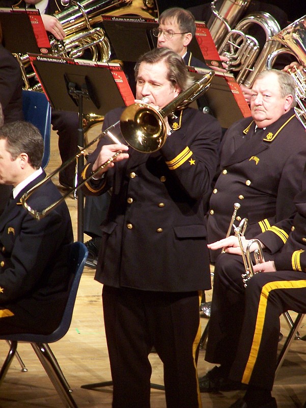 Dan Cassady, long-time member of the King Band and a frequent Trombone soloist was the guest soloist for this concert. Mr. Cassady performed the traditional solo, Atlantic Zephyrs by Gardell Simons, along with the beautiful Irish ballad, Londonderry Air. Mr. Cassady recently retired as director of bands at Iowa Central Community College, and presently teaches at St. Edmond High School in Fort Dodge. He also performs with many area groups, including Jive For Five.
