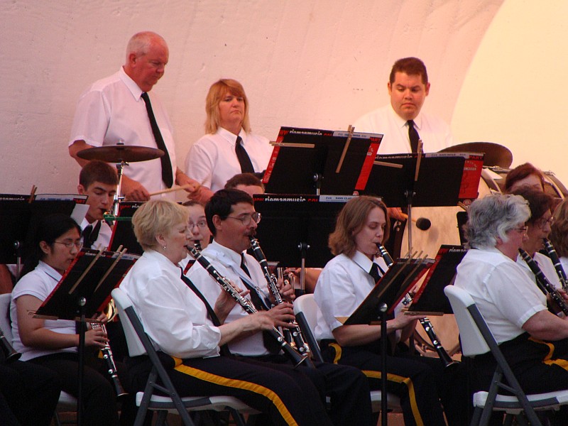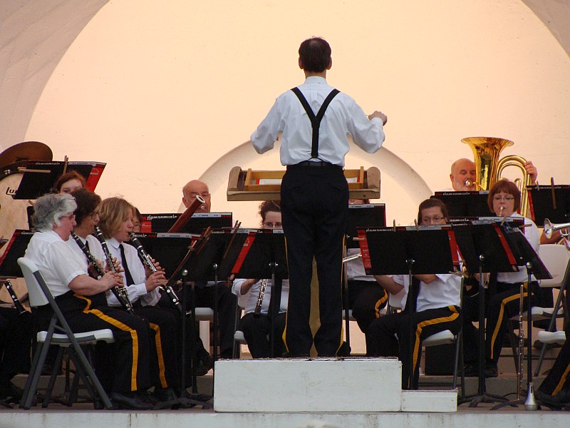 This evening's program included a number of compositions written by the band’s namesake, Karl L. King. Those featured were his march, Iowa Centennial, his famous galop, The Big Cage, and a beautiful aerial waltz, Mystic Night. The novelty featuring the trombone section, Mournful Maggie was not performed because the concert was shortened when rain threatened.