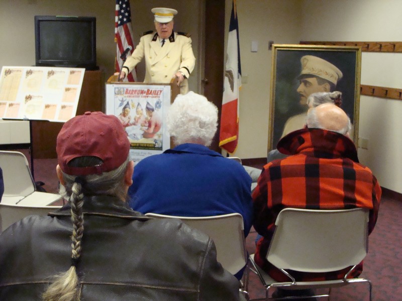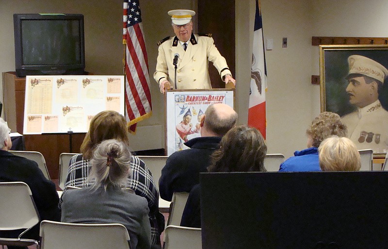 On Saturday, February 20, an open house was held at the Fort Dodge public library. This event was organized by longtime King Band member and historian Nancy Olson, assisted by her daughter Susan, both Windjammers. Nancy and Susan chose to feature music and artifacts from the earliest part of King's career: the nine years he spent trouping with various circus bands, first as a euphonium player and later as a bandmaster. Exibists showcased each year of King's circus career, including maps showing the routes King traveled during each of those nine years. In many cases, the route books, programs, advertising, and other fascinating artifacts from those years was displayed. Of course, many Karl King musical selections were displayed as well, many showing dedications to circus performers and band members King worked with during his time as a circus musician. Retired Fort Dodge music educator Larry Mitchell was on hand, attired in an authentic Karl King uniform, and in character as Mr. King. Larry gave a wonderful presentation about King's life and career, from the first person, and captured Mr. King's sense of humor as well as his humility for which he was well known. Also on hand was retired circus aerialist Sarah Chapman, whose career included tenures with Ringling Bros. Barnum and Bailey, King Bros., Carson and Barnes, and a host of other shows. Sarah spoke of the musicians with whom she worked during her career, including Bill Pruyn, Boom Boom Browning, and Illy Cervone. Sarah, a Florida native who participated in the Sailor Circus as a youth, told many engaging stories about her life and career with the circus. Present day King Band conductor Jerrold P. Jimmerson was also on hand, and brought a personal scrapbook containing many programs, news clippings, and photographs from his early years as a member of the King Band. Also in attenance was the granddaughter of Karl King, Michelle King Matlock, who travelled from her home in Indianapolis. Michelle enjoyed meeting many fans of her grandfather, and also shared many personal recollections of him. On Sunday February 21, the Karl L. King Municipal Band presented a gala 125th birthday concert at Iowa Central Community College's Decker Auditorium. Conductor Jimmerson selected a program featuring music from King's circus days. Assistant conductor Dr. David Klee conducted two selections, and vocal soloist Robert Patton performed two selections with the band. The concert was enthusiastically received by a large and appreciative crowd. The Karl King birthday concert is a tradition with the King Band, and it opens a series of three indoor winter concerts, before the band moves outdoors for its summer concert series. by Andrew Gover, WJU #423