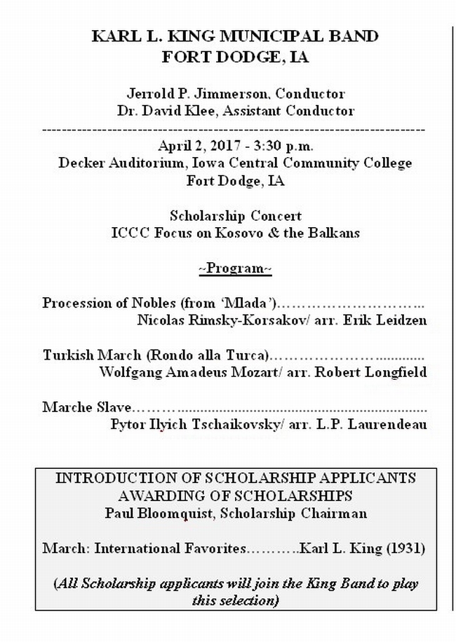 This April concert coincides with Iowa Central Community College’s Focus series. This year the college has chosen the country of Kosovo and the Balkan region for its cultural emphasis, and these selections on the program reflected their heritage in music.