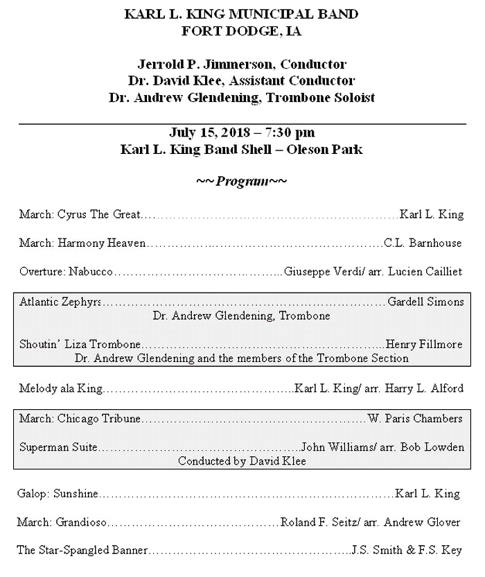 His father, Richard L. Glendening, played trombone in the Fort Dodge Municipal Band in the early 1940’s under Karl King. Richard graduated from Fort Dodge High School in 1942 and went on to the University of Iowa before being drafted. Andrew Glendening states that “although he [his father] ended up in a medical career, the experience he had in the band was one of the most important ones in his life. We have some great home movies of parades with King leading the band with his double bell euphonium”. Andrew Glendening learned to play on his father’s old horn, which he still has.