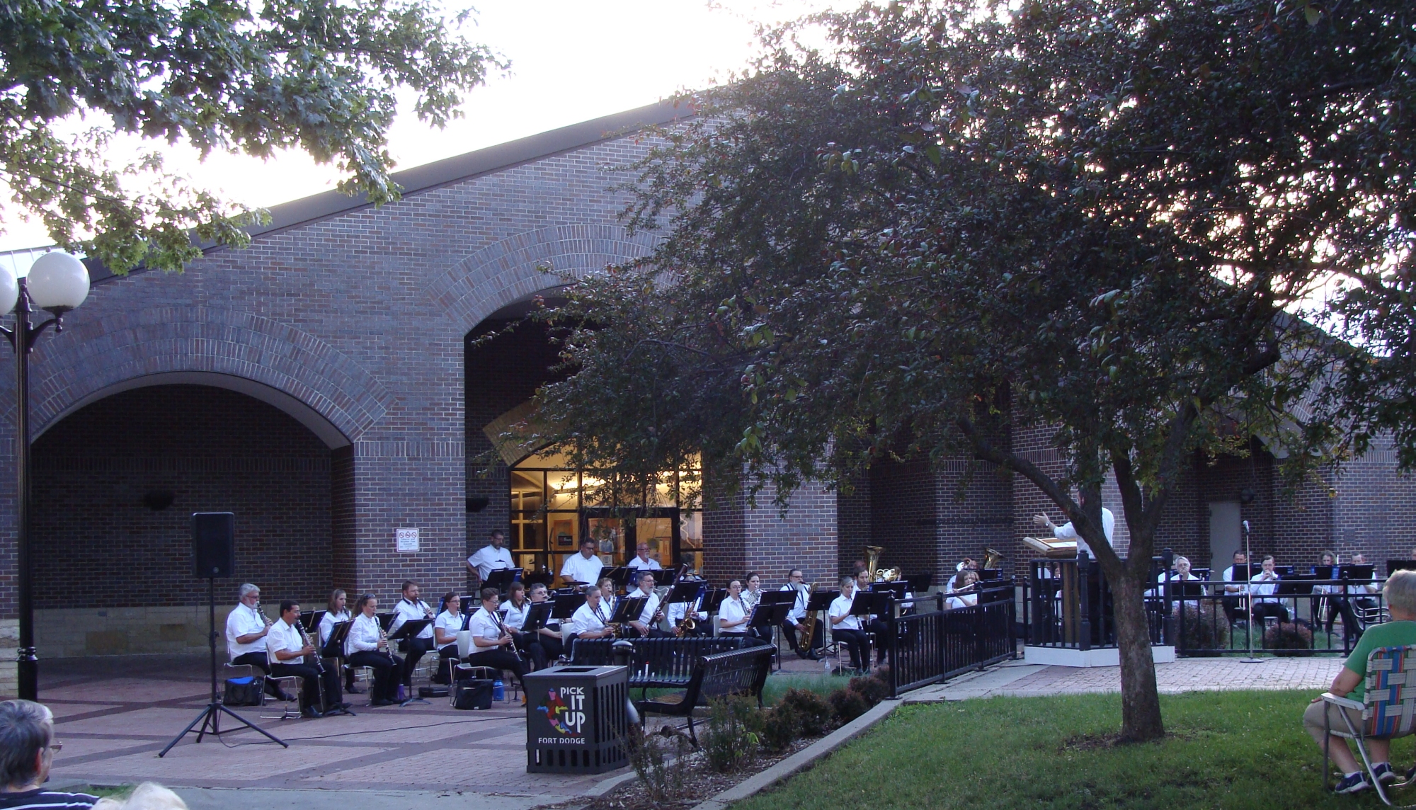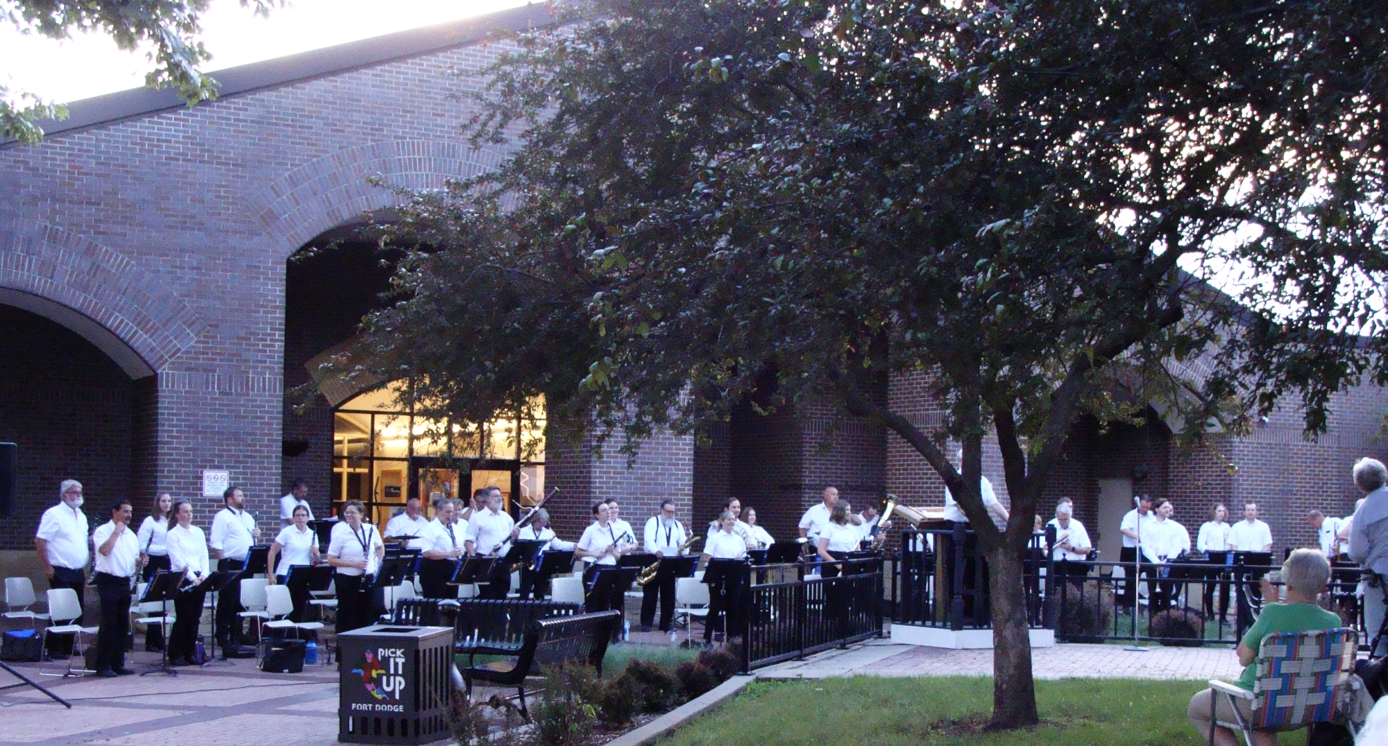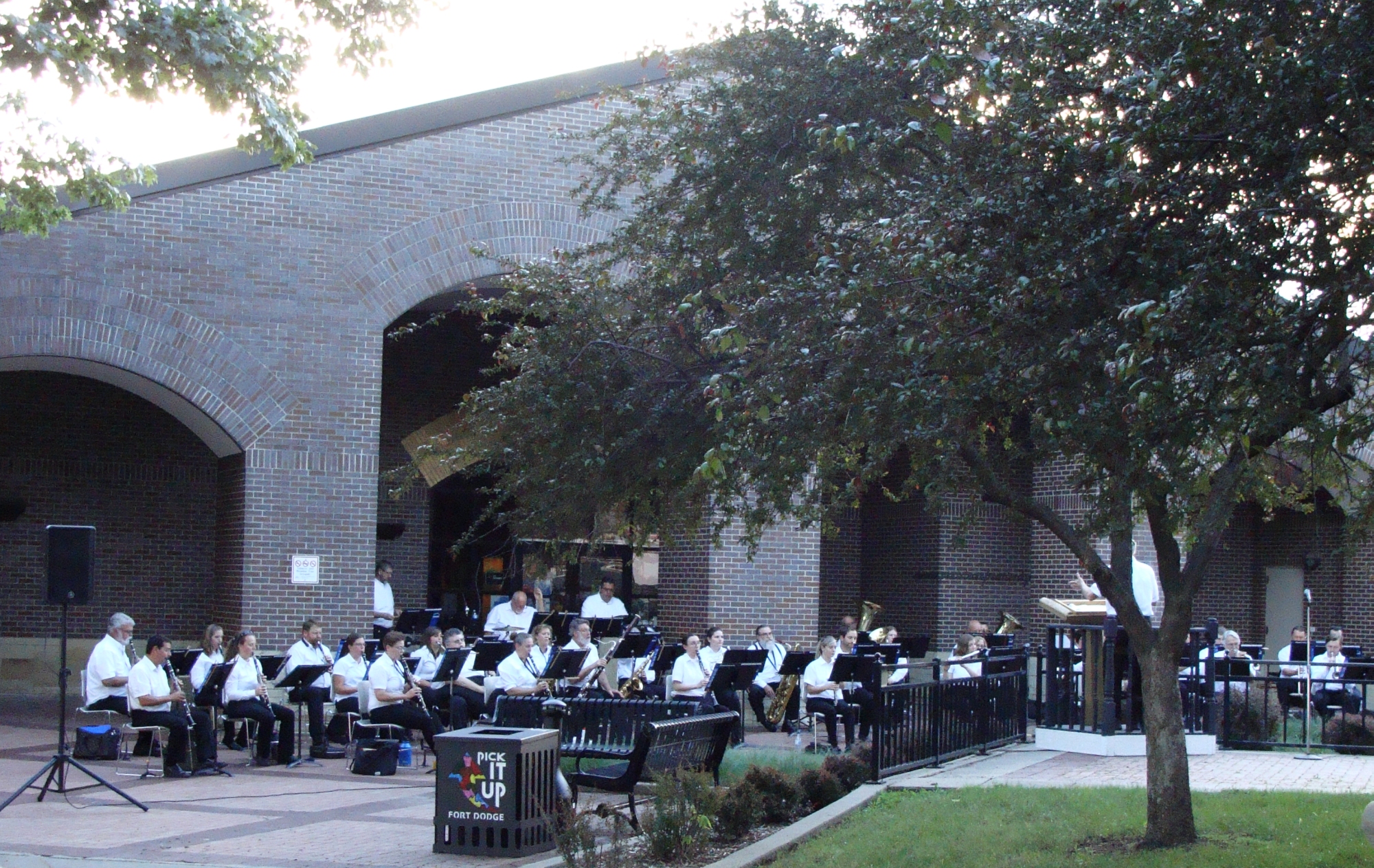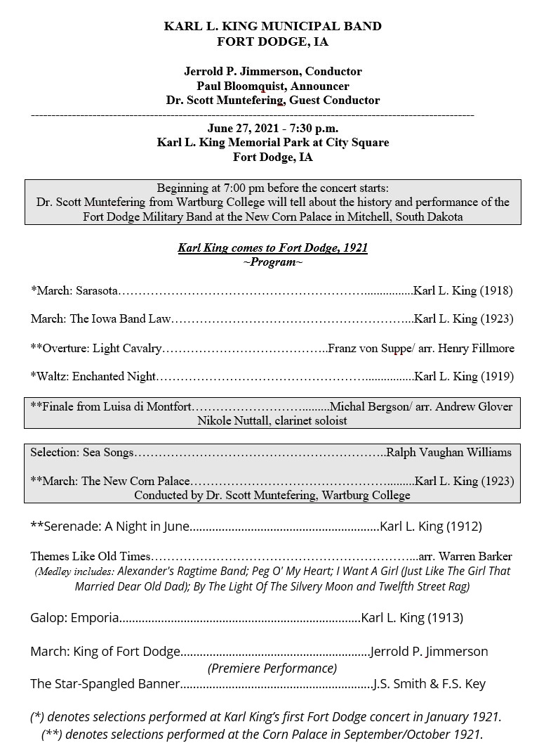 The Conductor of the Karl L. King Municipal Band is Jerrold P. Jimmerson with Dan Cassady serving as the Assistant Conductor and Paul Bloomquist doing the announcing. This concert was held at the Karl L. King Memorial Park located in front of the library downtown at the City Square. This concert was a celebration of Karl King’s arrival in Fort Dodge 100 years ago in the fall of 1920, and the many musical events surrounding his first year here. His first concert was in January, 1921 at the Princess Theater downtown. That concert opened with King’s march, Sarasota, which he dedicated to his friend and previous employer, John Ringling. Because this concert is celebration 100 years, this evening's program also began with the playing of Sarasota.