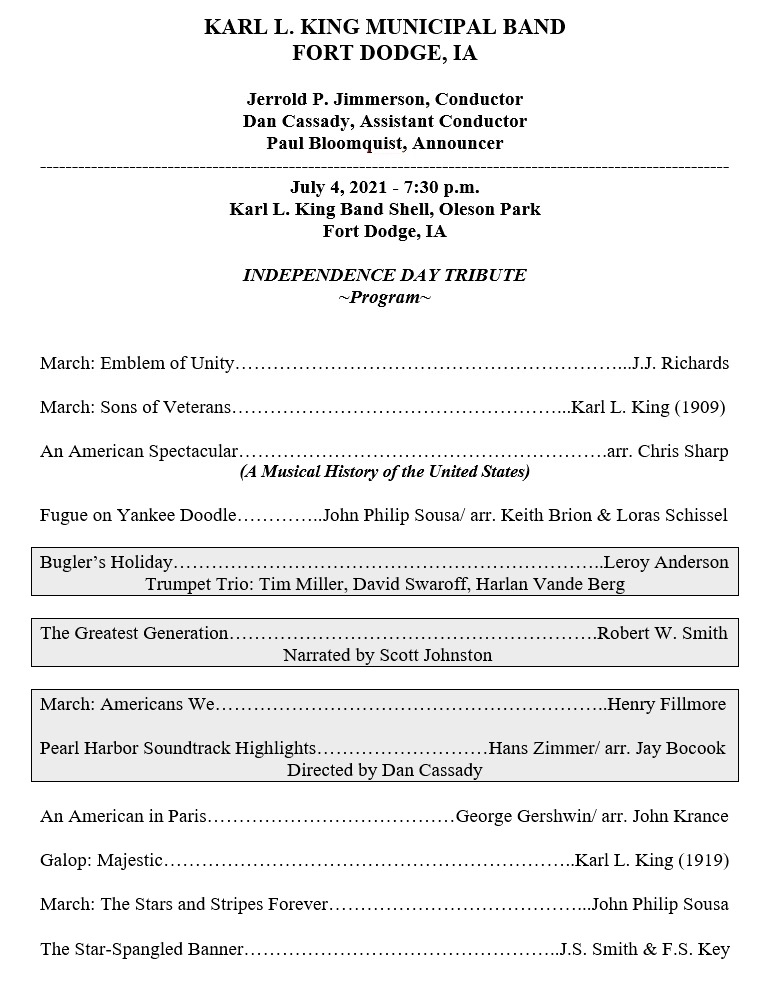 Conductor of the Karl L. King Municipal Band of Fort Dodge, Iowa is Jerrold P. Jimmerson, with assistant conductor Dan Cassady and announcer Paul Bloomquist.