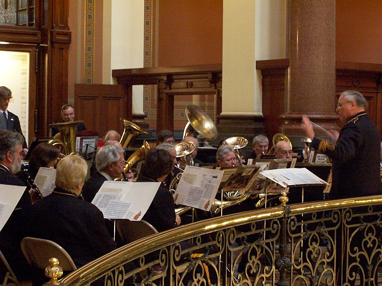 To highlight Senator Daryl Beall's resolution to honor the memory of Karl King by commemorating him with a U.S. Postage stamp, the Karl King Band performed in the Iowa Capitol Rotunda on April 11, 2006. This opportunity came up very quickly for us, said band director Jerrold Jimmerson, but it is an excellent opportunity for the band to bring the name and music of Karl King to the attention of the people of Iowa. His legacy reaches around the world. The resolution and submitted stamp designs will be given to the U.S. Postage Stamp Advisory Committee in May for their consideration and decision.