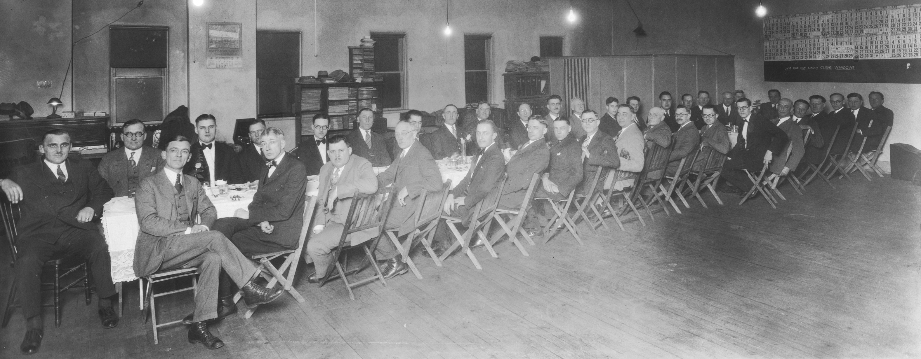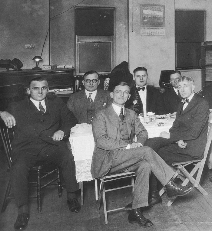 Tim Pray and other band members are pictured in 1928 dining in their humble rehearsal hall above a harness shop in Fort Dodge. At left is Walt Engelbart, the band's manager. To the right of Walt on the far side of the table are Lou Pray (Tim's dad) and Tim Pray. In the foreground at right is Cy Tremain. The entire photo shows all band members and Karl King.