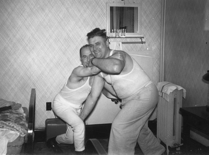 Ralph Pee Wee Peer and Tim Pray are shown clowning around in their room at the Tangney Hotel in 1946 during their stay at the Clay County Fair in Spencer, Iowa.